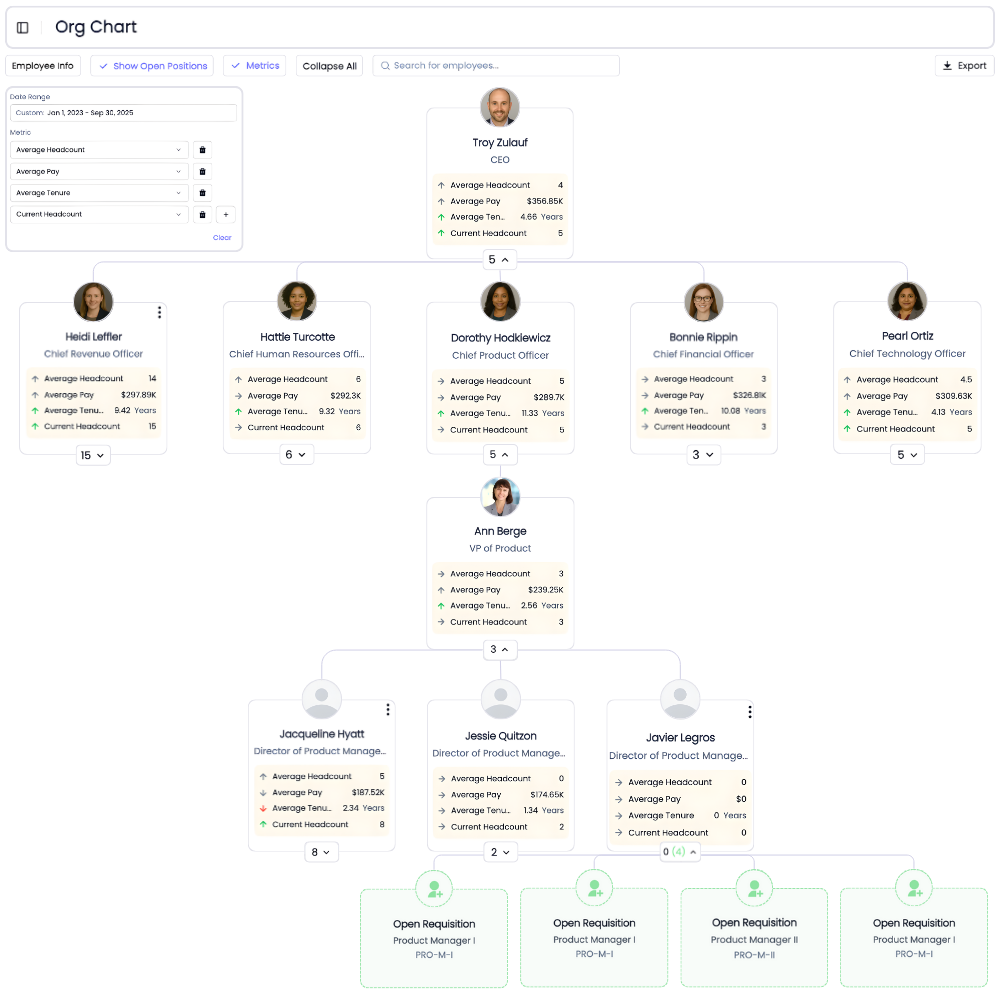 See your organization with live metrics layered directly onto the org chart. Track open requisitions, spans of control, and risk areas in context, so workforce planning conversations happen with real data.